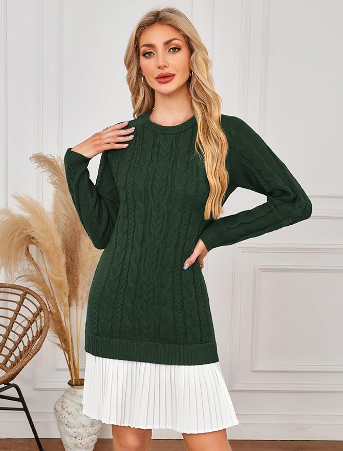 - This stylish mini dress features a classic crew neck and chunky cable knit texture, offering a cozy, high-end look modern silhouette