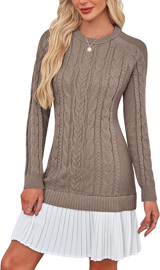 - This stylish mini dress features a classic crew neck and chunky cable knit texture, offering a cozy, high-end look modern silhouette